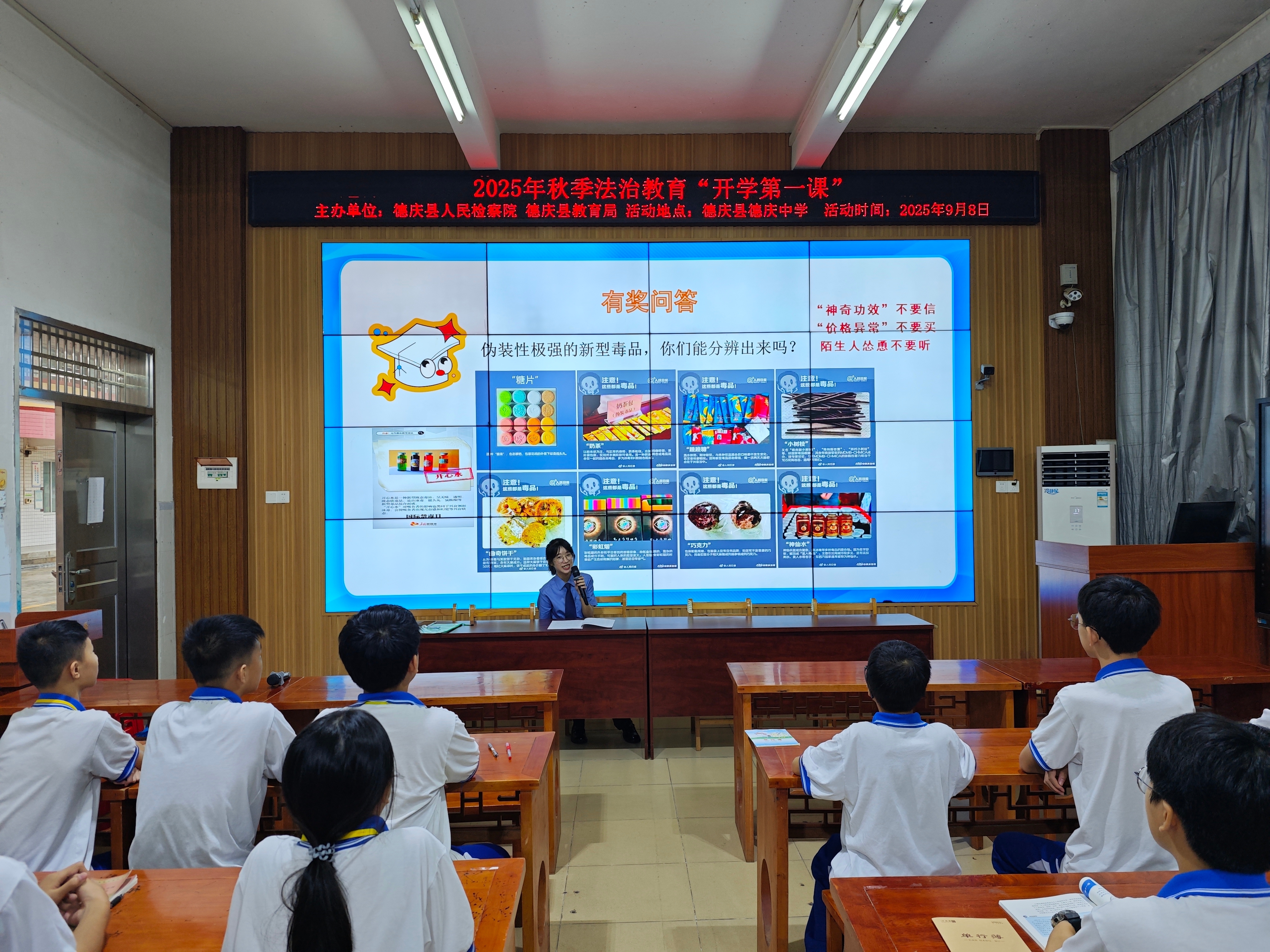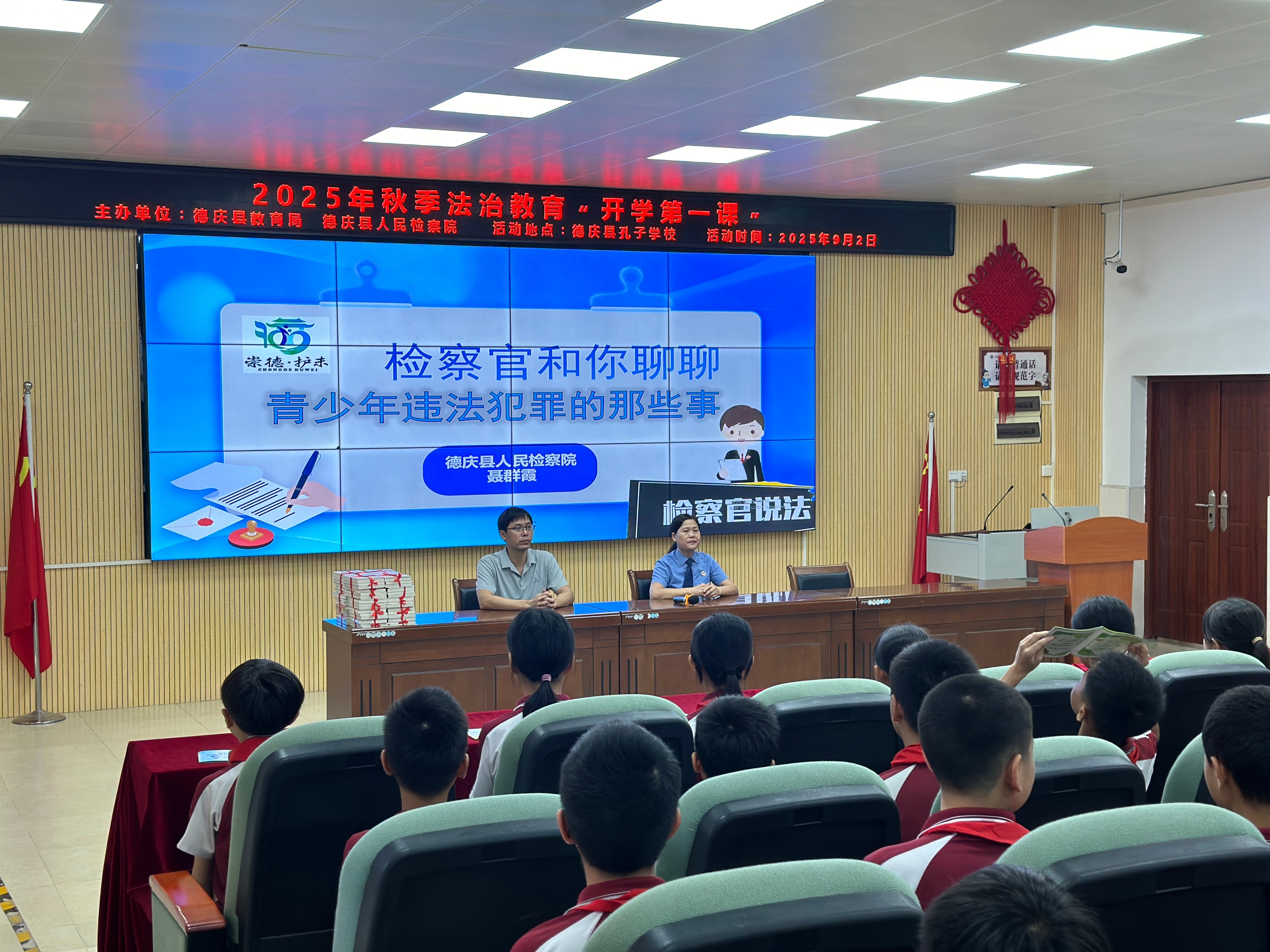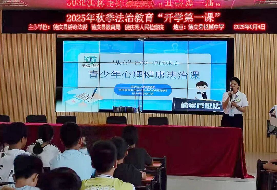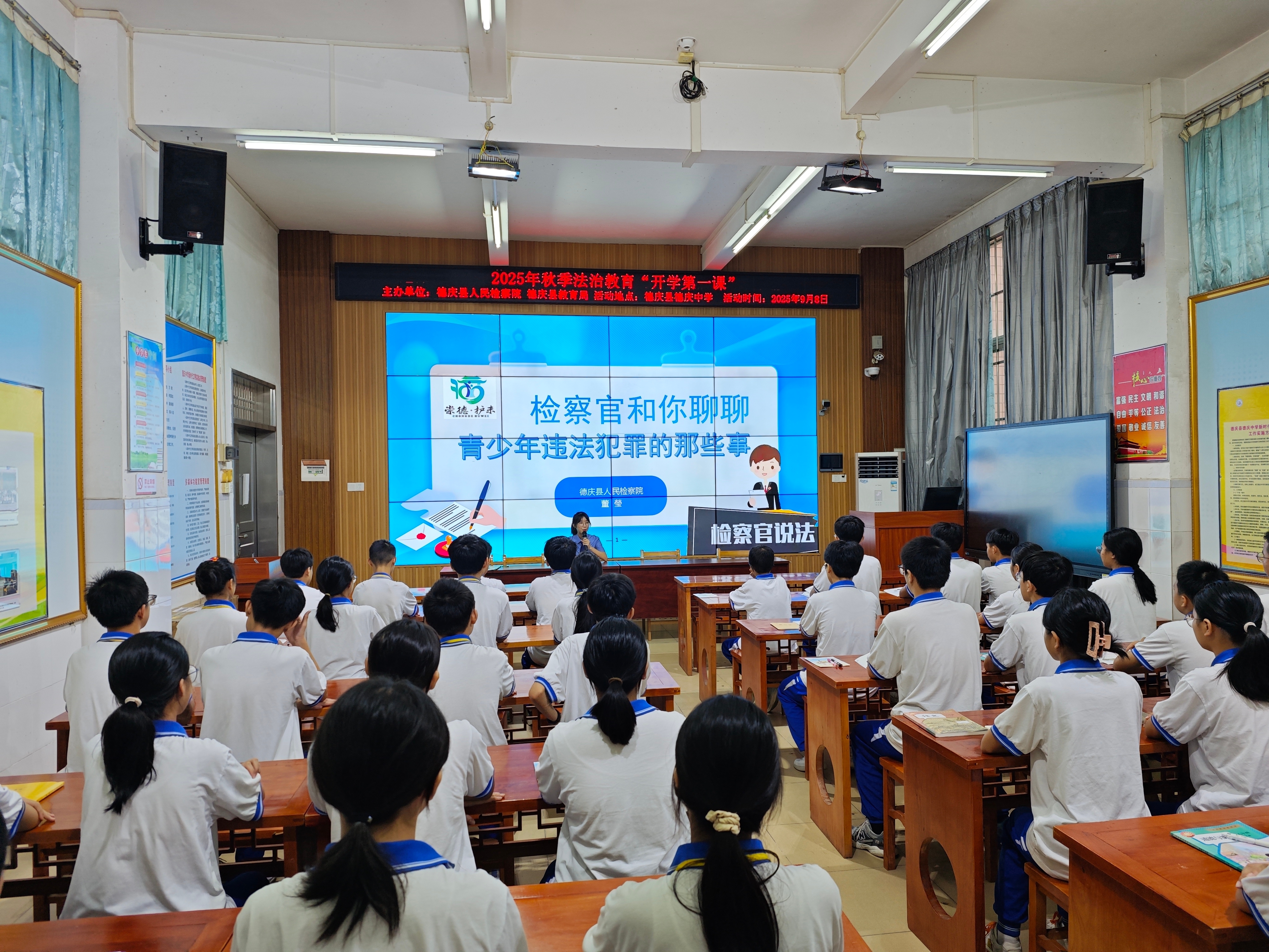 上课铃响,德庆县检察院的“法治副校长”们先后走进孔子学校、悦城中学、德庆中学等多所学校“开讲”,为同学们送上新学期的第一节法治教育课。