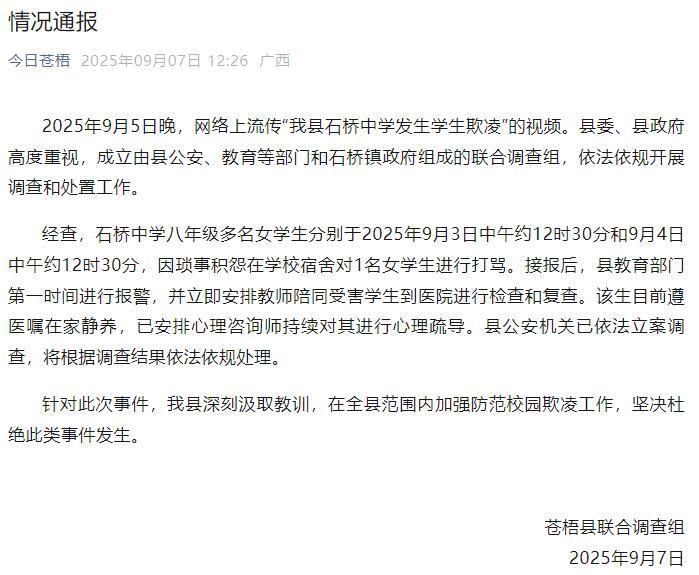 此前9月7日,广西苍梧县联合调查组针对此事件发通报表示,石桥中学八年级多名女学生分别于9月3日中午约12时30分和9月4日中午约12时30分,因琐事积怨在学校宿舍对1名女学生进行打骂。接报后,县教育部门第一时间进行报警,并立即安排教师陪同受害学生到医院进行检查和复查。该生目前遵医嘱在家静养,已安排心理咨询师持续对其进行心理疏导。