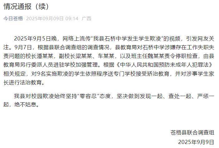 9月9日,广西苍梧县联合调查组再发通报称,根据县联合调查组的调查情况,县教育局对石桥中学涉嫌存在工作失职失责问题的校长潘某某,副校长梁某某、车某某,以及班主任魏某某责令停职检查,由县教育局另行委派人员进驻学校加强管理。根据《中华人民共和国预防未成年人犯罪法》相关规定,对9名实施欺凌的学生依照程序送专门学校接受矫治教育,并对涉事学生家长进行法治教育。
